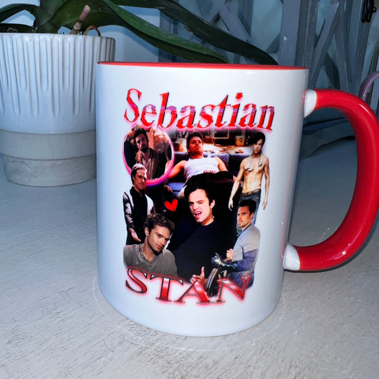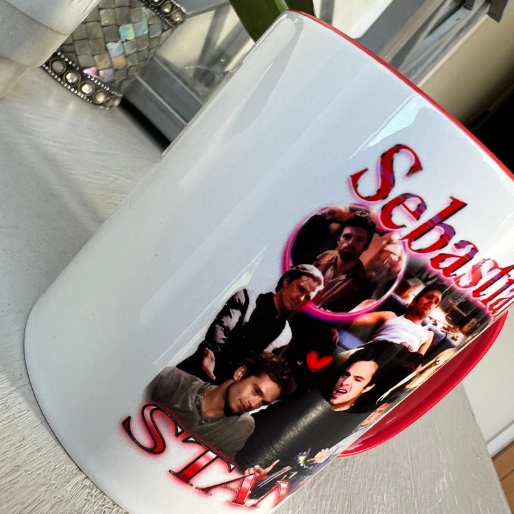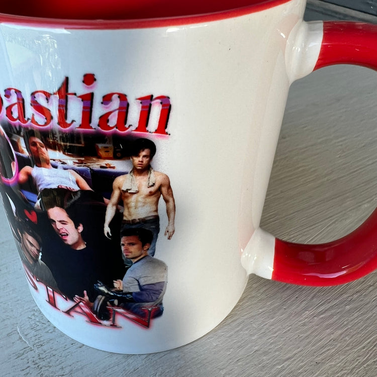 New, super cute Sebastian Stan homage printed mug - With red handle and interior